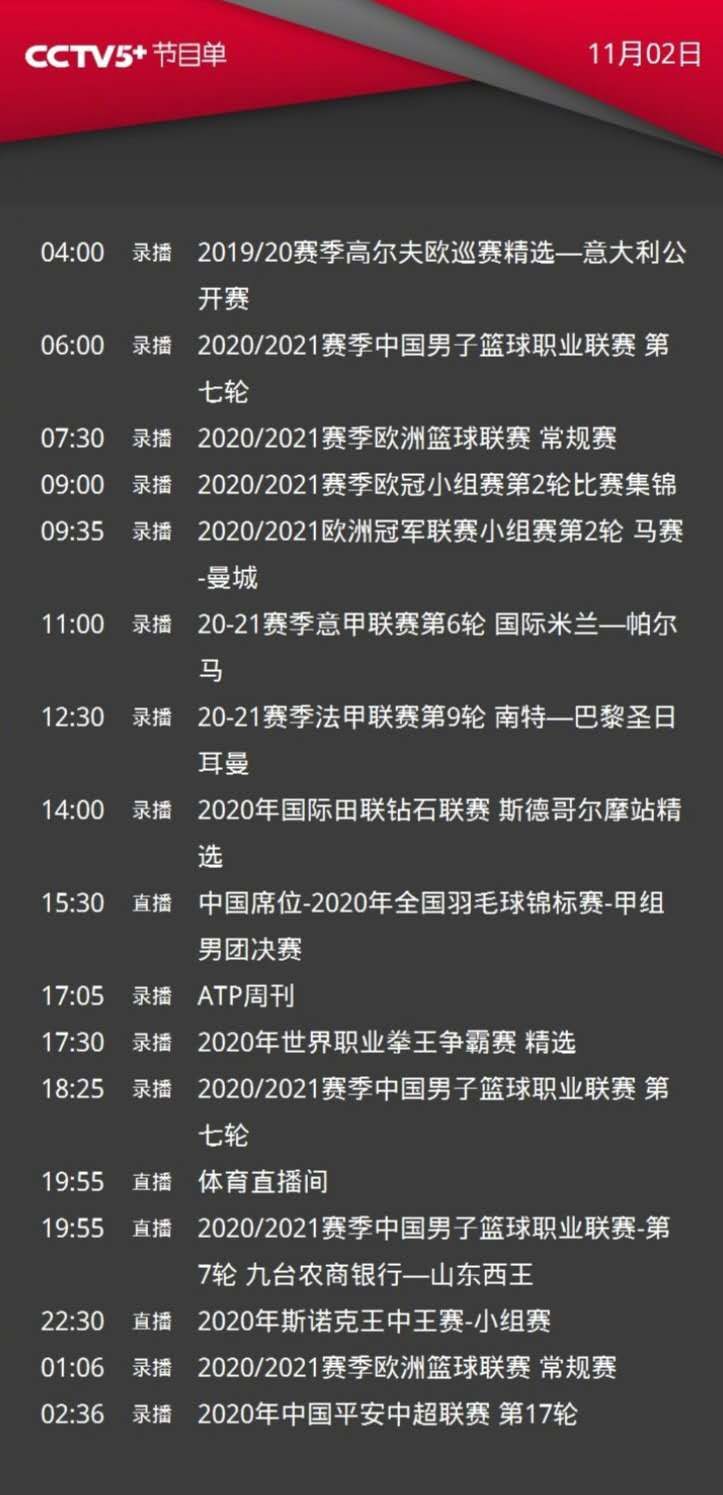 CCTV5+19:55直播2020/2021赛季中国男子篮球职业联赛-第7轮(九台农商银行—山东西王)。22:30直播2020年斯诺克王中王赛-小组赛1。