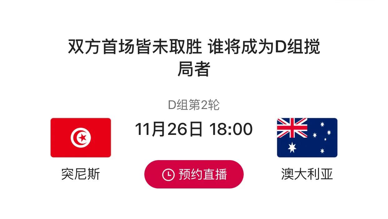 11月26日,2022年世界杯D组第二轮首场比赛,突尼斯对阵澳大利亚。在D组的比赛中,这两支球队第一轮比赛都未取胜,澳大利亚队在首场比赛中1-4输给卫冕冠军法国队,突尼斯队则在首场比赛中0-0逼平了比这支北非球队强大得多的丹麦队。