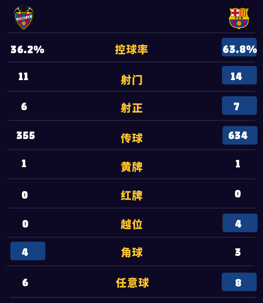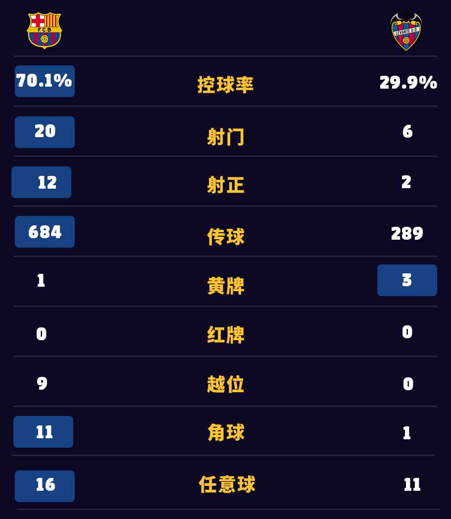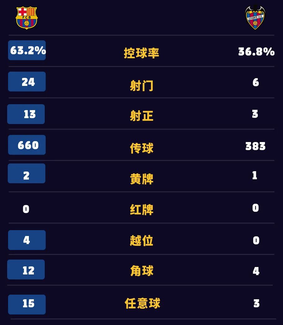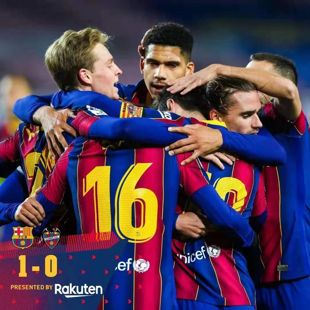 全场比赛结束,巴萨1-0莱万特,拿下三分!
