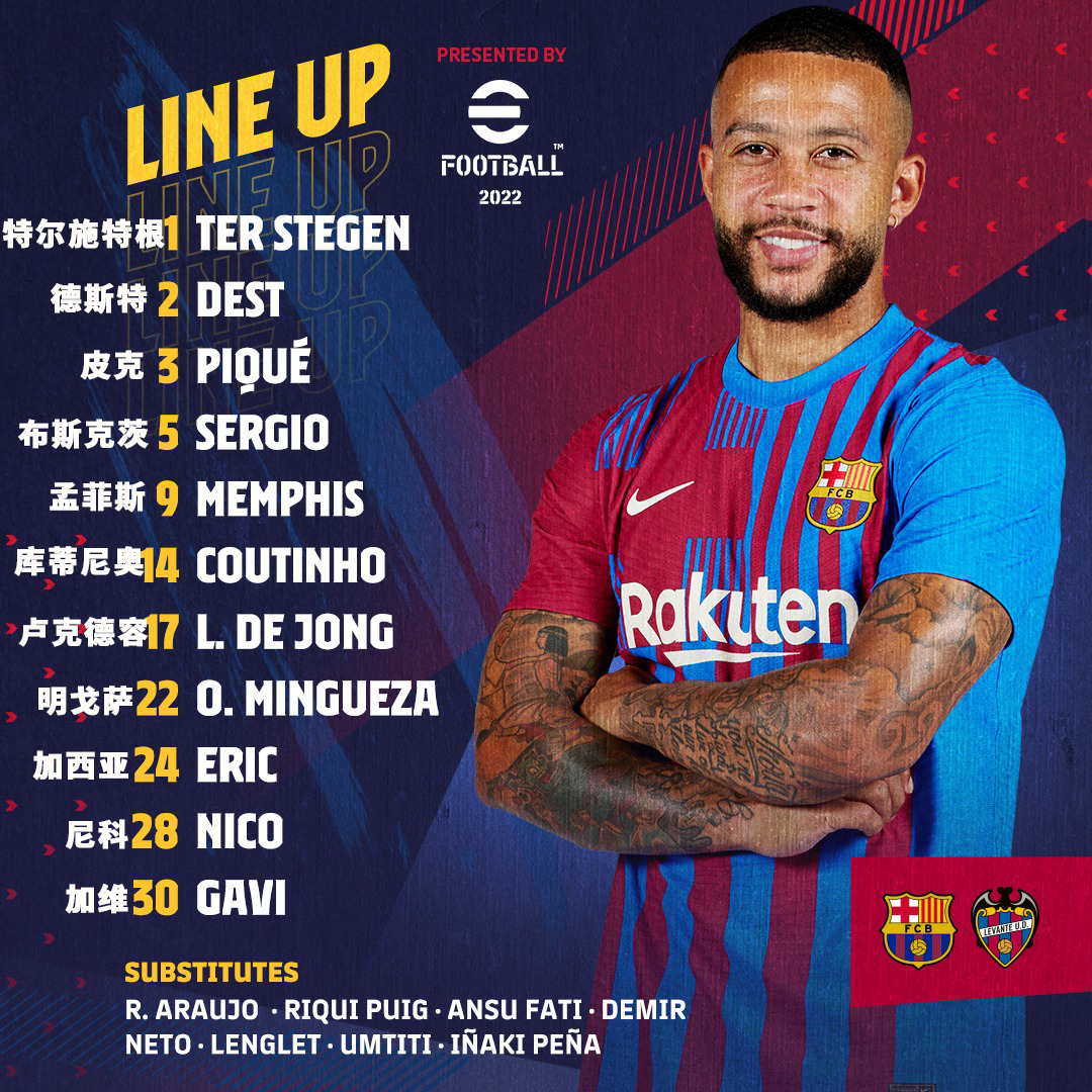 前锋:9-孟菲斯,14-库蒂尼奥(59' 6-普吉),17-卢克德容(79' 10-法蒂)