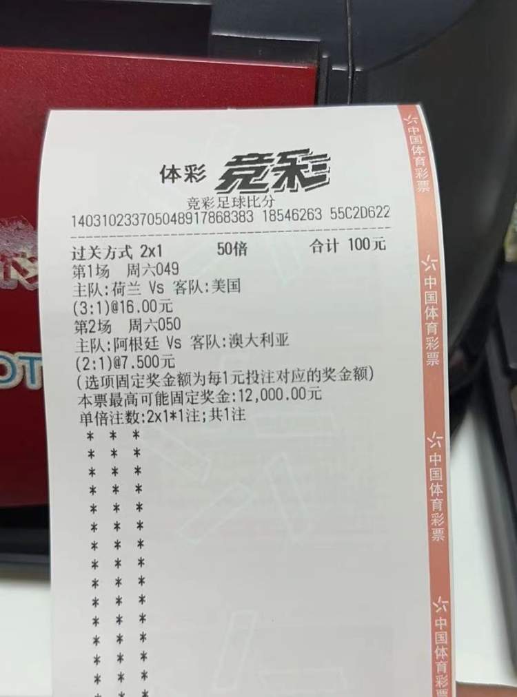 沪上不少竞彩高手又中出这两场比赛的神单。这张出自闵行区都市路4162号的编号为09707的体彩销售网点。这位彩民进行了竞彩比分2串1的投注,第一场荷兰VS美国,单挑比分3:1;第二场阿根廷VS澳大利亚,单挑比分2:1。单注2元,进行50倍投注,总投入100元。随着两场比赛打出这两个结果,揽入奖金12000元,回报率达120倍。
