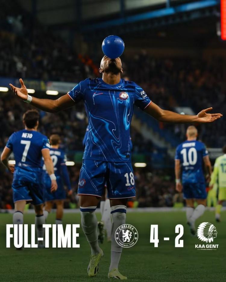 切尔西在欧协联4-2击败根特,蓝军取得各赛事5连胜。