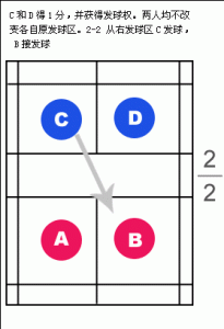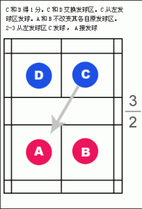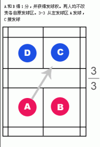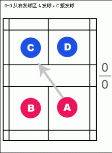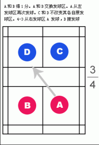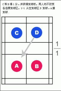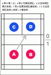 A和B对C和D的双打比赛。A和B赢了挑边并选择了发球。A发球C接发球。A为首先发球员,而C则为首先接发球员。