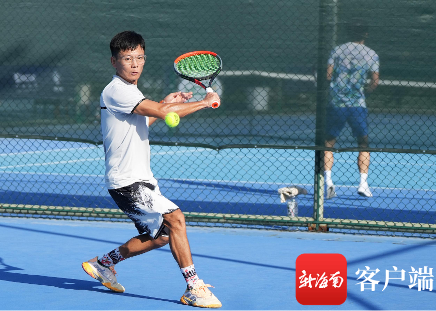 第二届中国大众网球联赛海南省级联赛暨2023年第13届海南省网球团体赛上,球员在奋力击球。记者 汪承贤 摄
