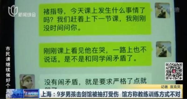 孩子的母亲洪女士表示,8月13日,自家9岁的儿子在位于上海市松江新城一家名叫"名剑击剑培训"的击剑馆内训练 。事发当天晚上8点左右,儿子下课回家,洪女士就看到他身上的伤,整条腿都是肿的,虽然当时还没泛出淤青,但腿上全是棍子抽的红印子,有十几条。