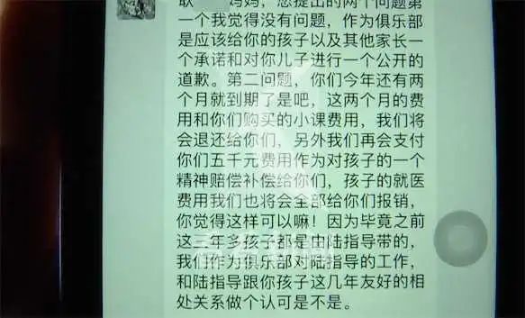 馆方表示,这名教练采用了不当的训练手段,深表歉意,并承诺辞退教练 ,退还之后两个月的学费以及小课费用,并给予5000元的精神赔偿费,承担全部的医药费,但孩子母亲要求退还全部学费。