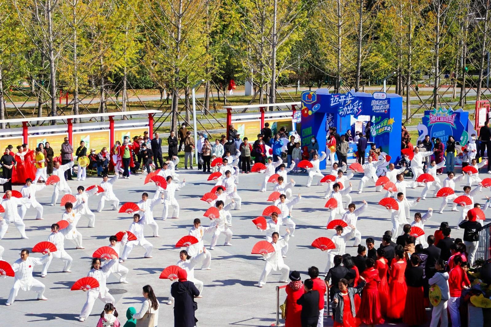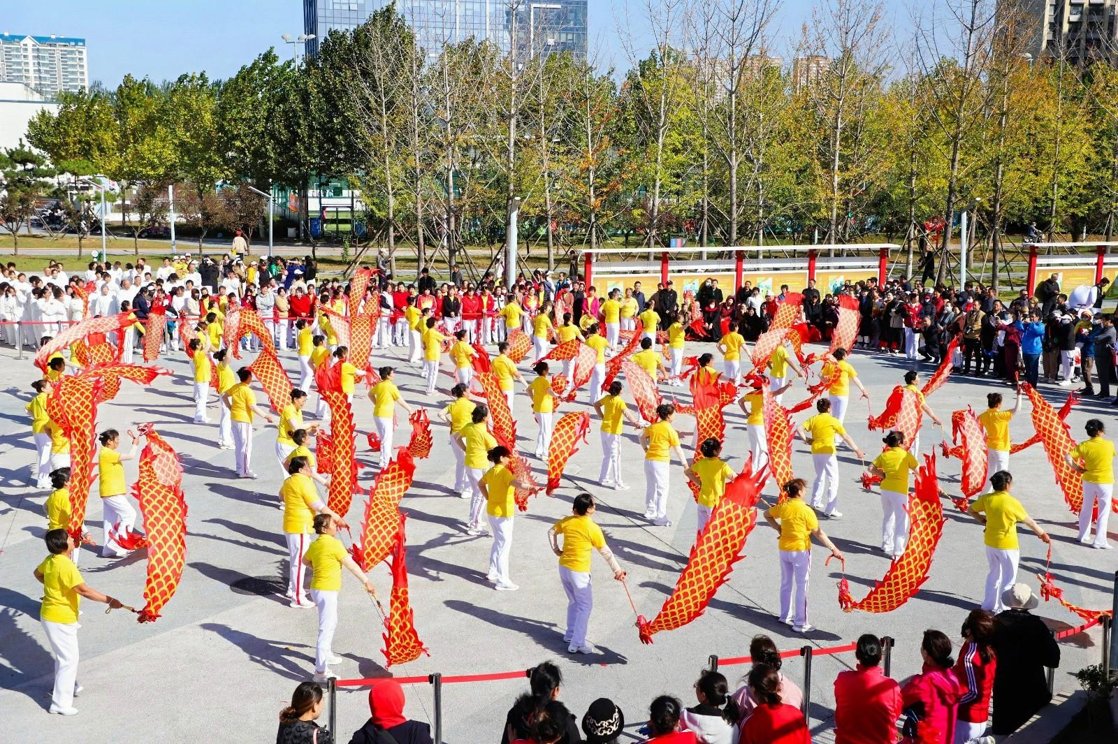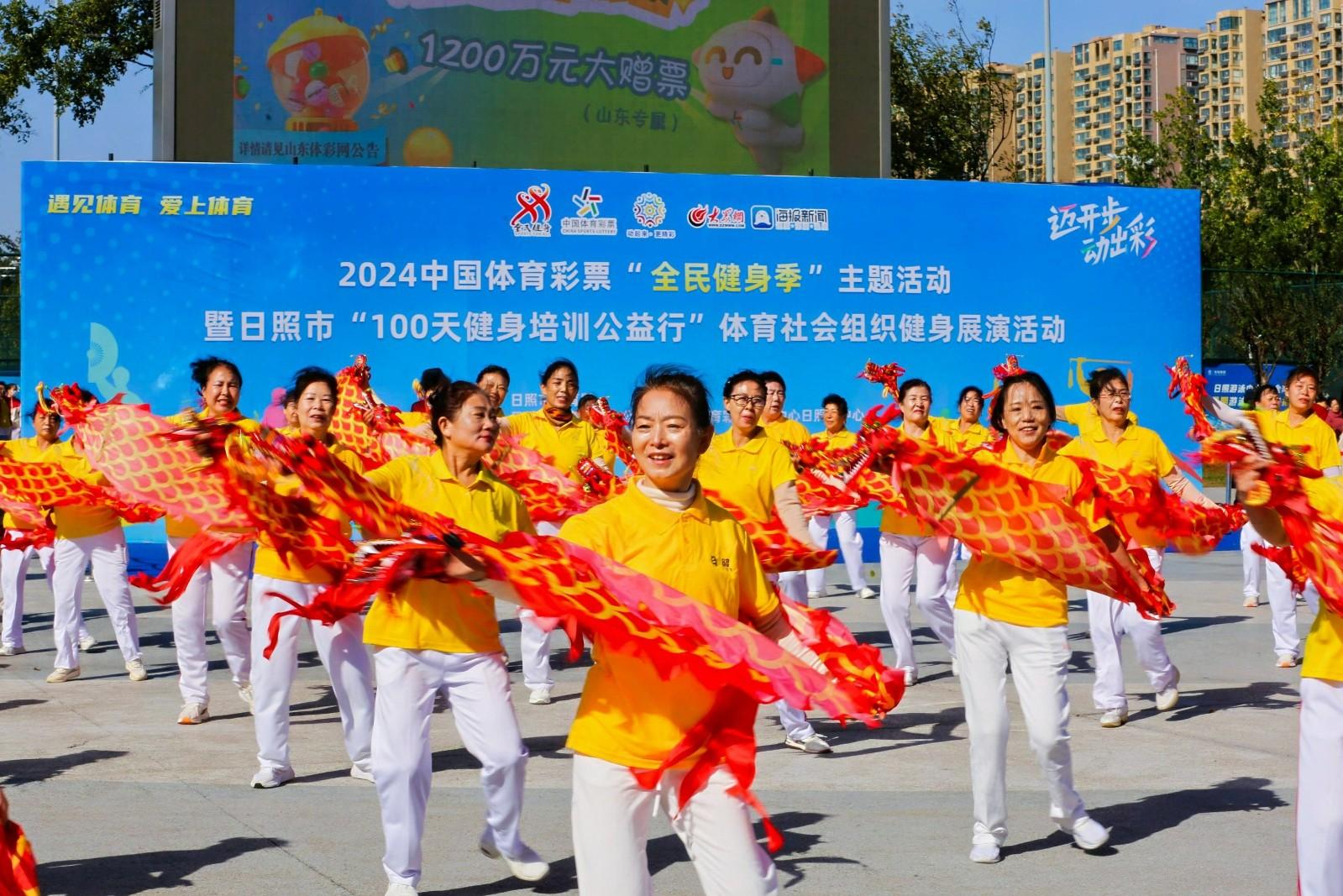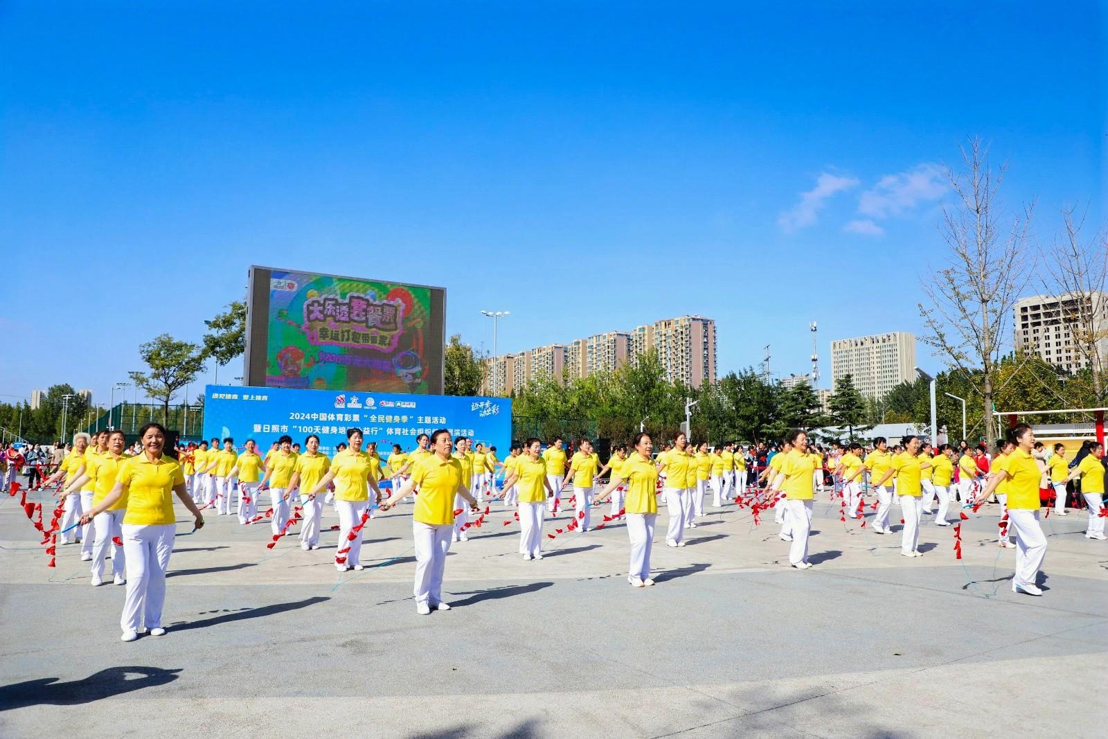 10月19日上午,“迈开步 动出彩”2024中国体育彩票“全民健身季”主题活动暨日照市“100天健身培训公益行”体育社会组织健身展演活动在香河体育公园举行。