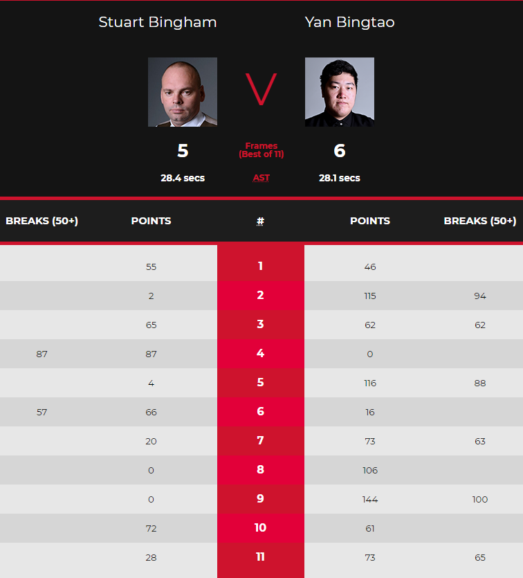 比赛开始后,颜丙涛与宾汉姆先是各下一局,1-1平分秋色。第三局,颜丙涛打出单杆62分后进攻红球失误,宾汉姆清台实现3分反超。随后一局,宾汉姆打出单杆87分,以3-1领先进入局间休息。
