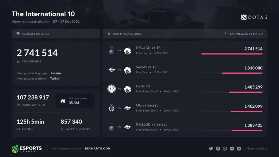 总奖金超过4000万美元的DOTA2国际邀请赛(TI10)10月7日至17日在罗马尼亚布加勒斯特举行。独联体战队Team Spirit在决赛中3比2战胜中国战队PSG.LGD,吸引了274万最高同时在线观众,比TI9的纪录提升了40%。