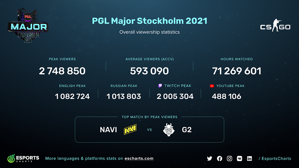 本次比赛是两年来的首个CS:GO Major,总奖金比往常翻倍到了200万美元,而收视纪录也实现了翻倍——NaVi对阵G2的总决赛观众峰值超过274万,创下新纪录。其中俄语与英语峰值均超过百万大关。