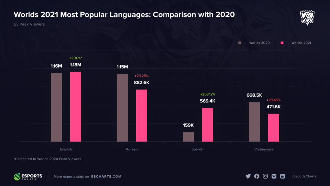 在不同语种直播流峰值方面,韩语流相较去年下降了23.25%。越南语流因为越南VCS赛区连续两届因为旅行限制且今年缺少越南选手(注:S10 LPL赛区SN战队打野SofM为越南籍)而下降29.45%。西班牙语流则暴涨258.12%,这或许和MAD战队西班牙打野Elyoya有关,而拉美粉丝也在本届世界赛期间表现活跃。