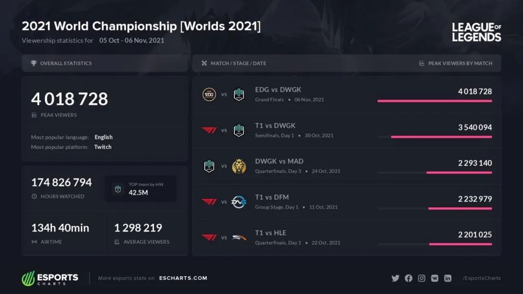 2021英雄联盟全球总决赛(S11)于10月5日至11月6日在冰岛雷克雅未克举行。本次全球总决赛EDG战胜DK的冠亚军决赛观众峰值超过401万,成为Esports Charts海外直播平台统计中首个超过400万观众峰值的端游电竞。这一纪录比2019年T1对阵G2半决赛时创下的398万观众峰值提升了1%。