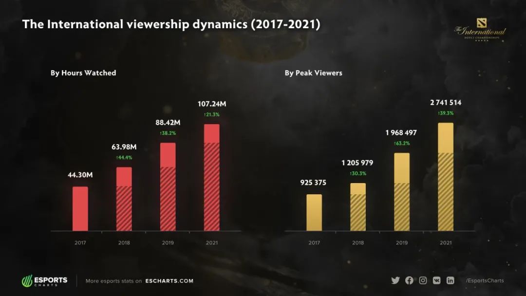 过去四届TI无论是总收看时长还是观众峰值都保持稳定增长,标志着DOTA2这个经久不衰的项目依旧有着很强的生命力。