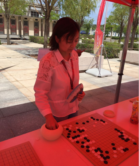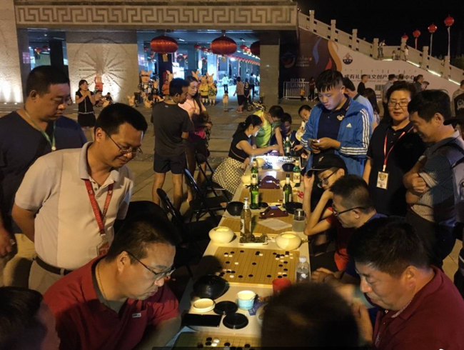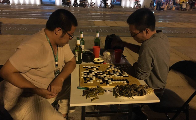 重头戏是晚间的啤酒围棋赛,啤酒围棋分别记分。小编的第一盘对手是一位七十岁的老爷爷,据他介绍他们五个来自北京的棋友组队来参加嘉年华的活动。老爷爷下棋的神态很专注,不时长考,一如当初他刚受中日擂台赛影响学习围棋那样。后边的对手是来自北京的小伙伴,他也是组队要参加全部的比赛,棋下的很激烈,但这似乎并不是最重要的,开怀畅饮,举杯聊天,结交志同道合的朋友,才是真正的乐趣。天色渐晚大家丝毫没有回去的意思,啤酒加毛豆,下棋聊天的阵地渐渐转移到了广场上,最后大家索性都不记成绩,下起了联棋。天南海北的棋友因棋结缘鄂尔多斯,不得不说是种缘分。