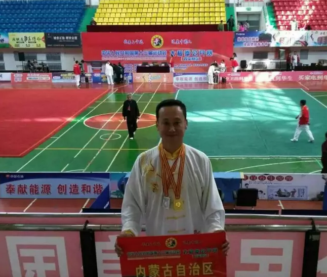 奈曼旗运动员王炯峰代表内蒙古通辽武术协会,在第一天上午太极器械比赛中喜获第一块金牌!