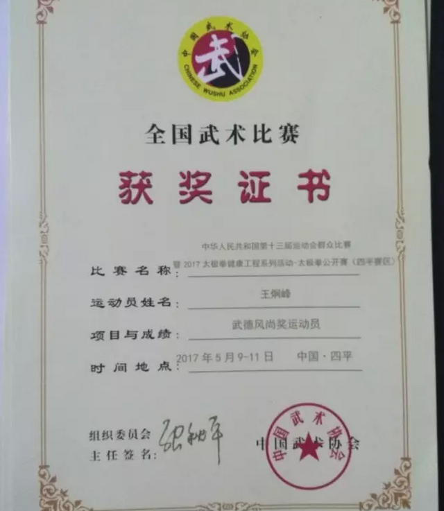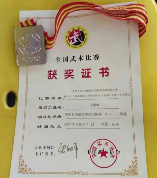 荣获全国武术比赛陈式太极拳二等奖……王炯峰: