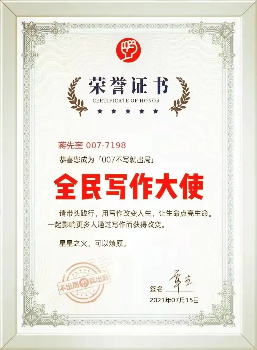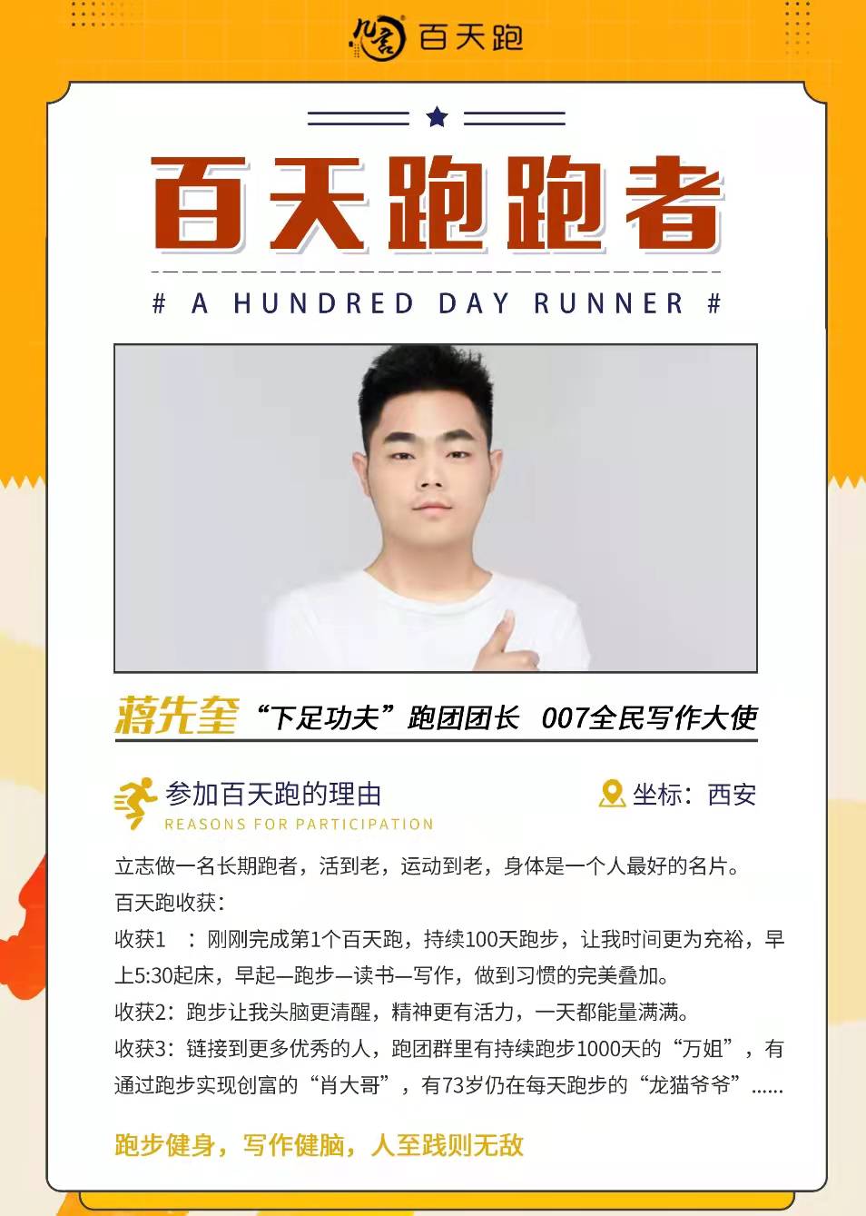 我是蒋先奎,百天跑者+007全民写作推动者。