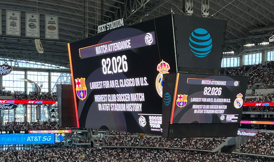 现场大屏幕显示,82026名球迷到场观战国家德比,这是AT&T体育场足球赛事上座新高。第72分钟,何塞卢换下贝林厄姆,巴萨则连换5人,法蒂、阿布德、德斯特、马科斯-阿隆索、费兰-托雷斯登场。