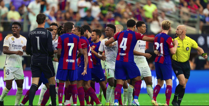 北京时间7月30日早上5点,达拉斯AT&T体育场,皇马VS巴萨。登贝莱破门,小将费尔明-洛佩斯世界波,费兰-托雷斯补射破门,巴萨3-0战胜皇马。全场比赛,皇马4次击中横梁,两队26次犯规,8张黄牌,堪称精彩激烈。