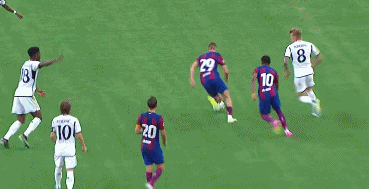 第36分钟,皮克向前带球失误,随后皇马发动反击。但维尼修斯和本泽马的射门先后被封堵。