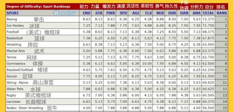 直播吧6月22日讯 ESPN邀请体育科学专家,对全球体育运动项目的难度系数进行评定,拳击排名第一,篮球第四,足球第十。