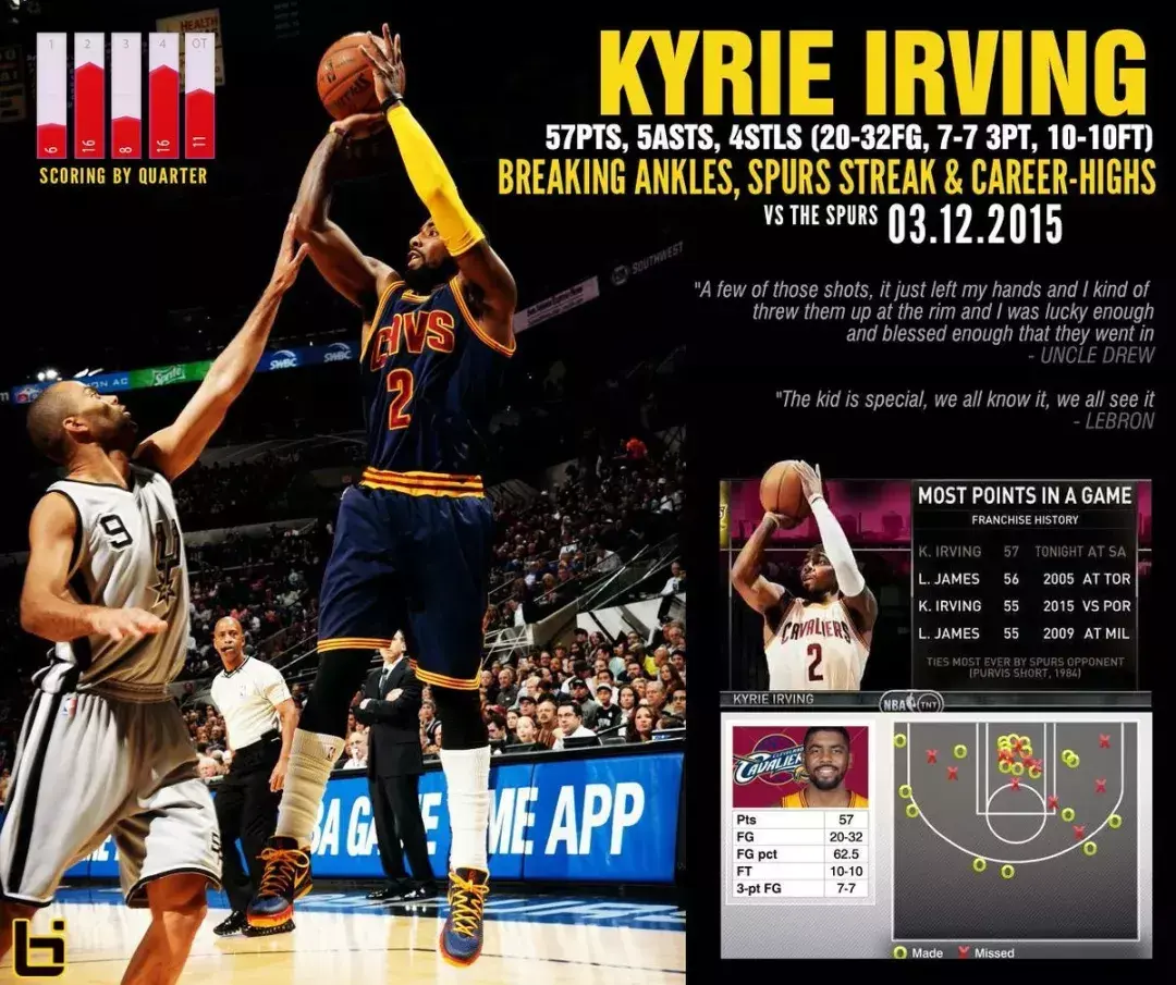 加时赛欧文面对车轮围剿如同天神下凡独取11分,他眼花缭乱的运球和犀利突破后的急停跳投令马刺无所适从。最终骑士以128比125险胜马刺,欧文全场32投20中,三分球7投全中,狂轰57分,刷新了职业生涯单场得分纪录的同时还打破了詹姆斯保持的骑士队史单场得分纪录,而这在与马刺的比赛中诞生更加难能可贵。