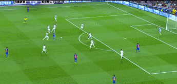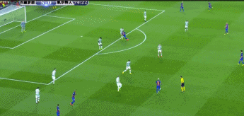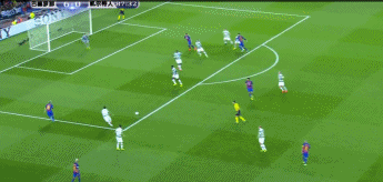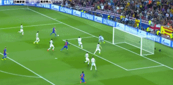 第59分钟,梅西直传,苏亚雷斯禁区右侧底线横传,梅西小禁区前点左脚铲射破门。5比0,梅西上演帽子戏法!