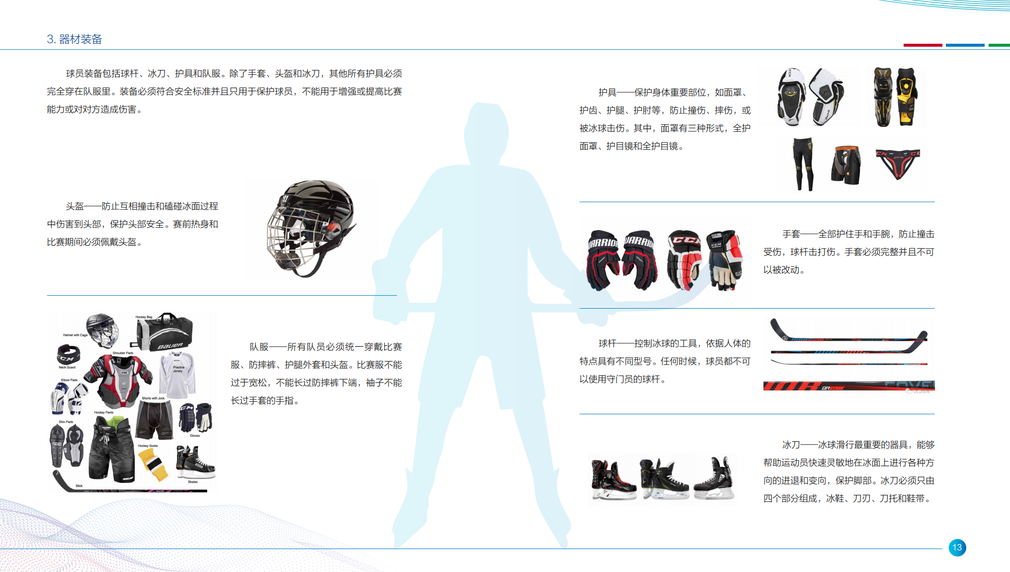 头盔——防止互相撞击和磕碰冰面过程 中伤害到头部,保护头部安全。赛前热身和比赛期间必须佩戴头盔。