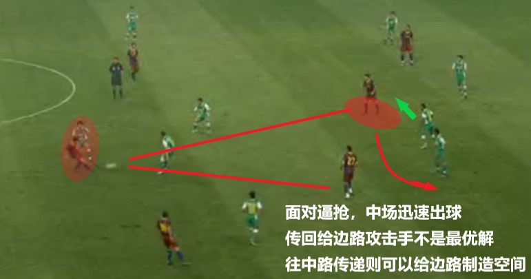 面对多人包夹,中场球员不停球直接送出传递,给到了更加靠近中路的无人看防的队友。此处若是再把球传回给边路攻击手,线路不理想,后者也不能转身面对防线。向中路传递则可以完成调虎离山,把防守队员打散开来。此处看似传给中路,实际在谋求边路的发展。