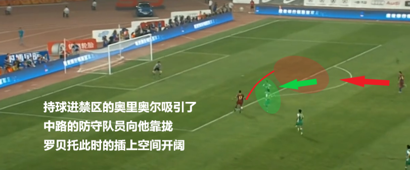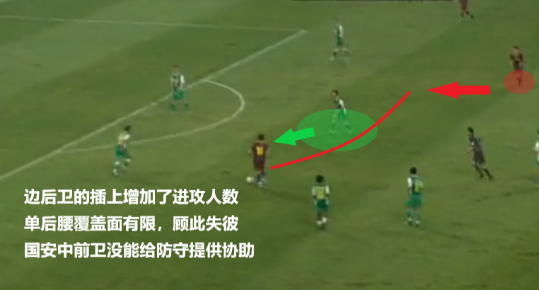 当奥里奥尔接直传球高速插上并甩掉跟防的防守队员时,国安中路的防守球员就比较难办了。罗贝托在中路插上接应,但持球的巴萨球员已经要进禁区了。无奈之下,他只能补到右路来,并试图用铲球的方式完成防守。奥里奥尔巧妙分球,中路跟进的罗贝托轻松得分。