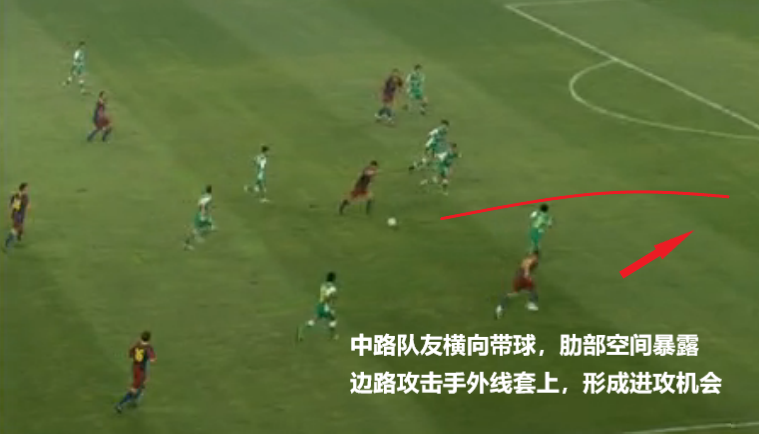 中路队友接球后转过身来向边路移动,边路攻击手趁机提速插上,给队友的分球留足空间。局部范围的四打五,巴萨这一次进攻过程精彩。