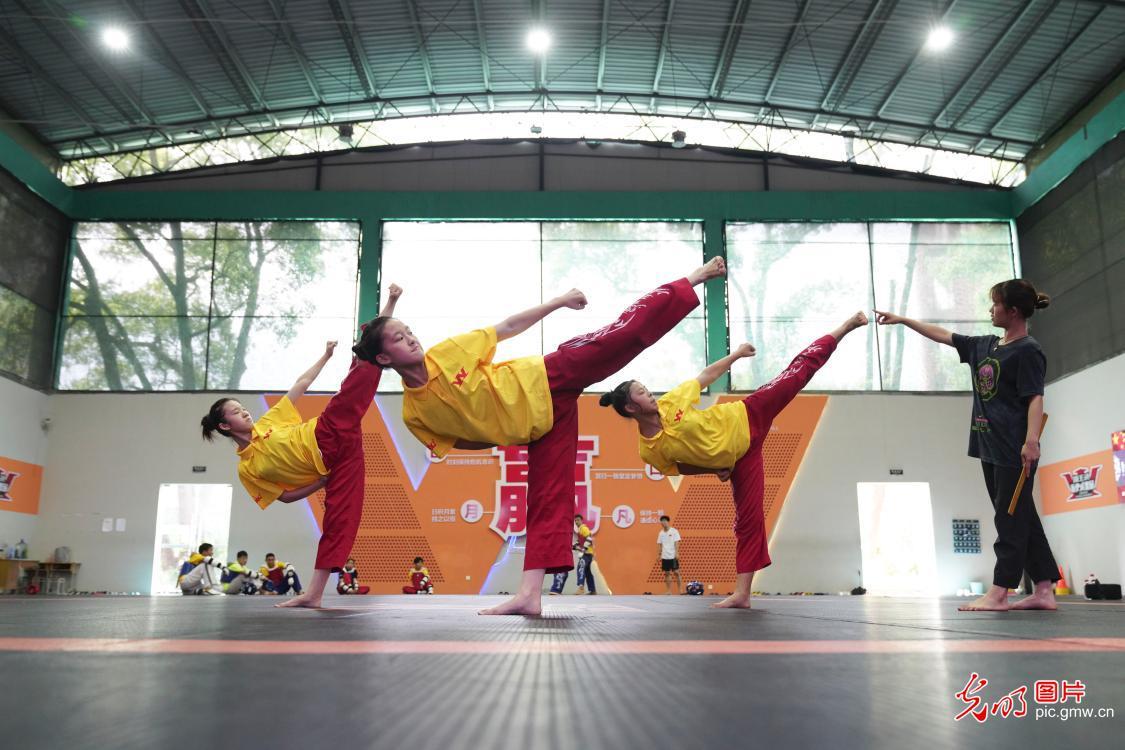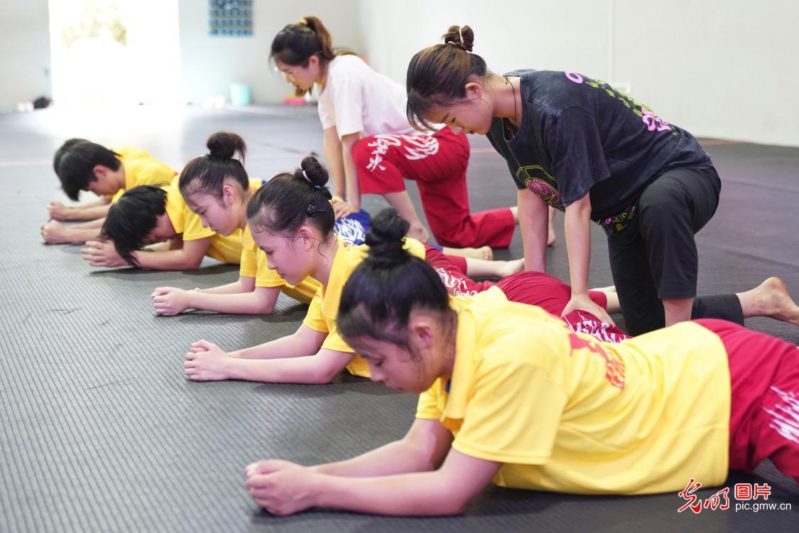 2021年8月12日,在重庆市残疾人跆拳道训练基地,运动员们在教练的协助下练习压腿。连日来,位于重庆市北碚区职业教育中心内的重庆市残疾人跆拳道训练基地,20名残疾人跆拳道运动员在教练的指导下,按照残疾人训练教学大纲和训练计划练习跆拳道竞技和品势,备战即将举行的2021年全国第十一届残运会。(秦廷富摄/光明图片)