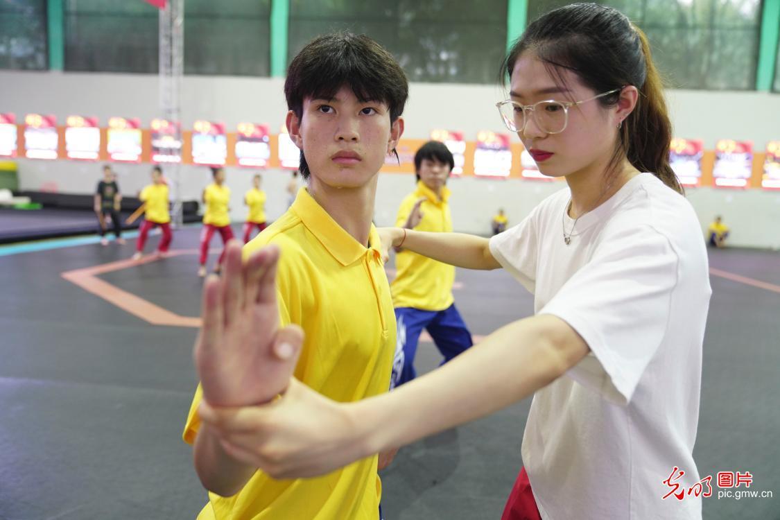 2021年8月12日,在重庆市残疾人跆拳道训练基地,一名教练在给运动员讲解动作要领。连日来,位于重庆市北碚区职业教育中心内的重庆市残疾人跆拳道训练基地,20名残疾人跆拳道运动员在教练的指导下,按照残疾人训练教学大纲和训练计划练习跆拳道竞技和品势,备战即将举行的2021年全国第十一届残运会。(秦廷富摄/光明图片)