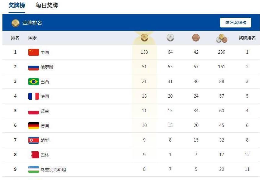 中国代表队也是首次问鼎军运会金牌榜第一。俄罗斯以51金53银57铜共161枚奖牌排名第二,巴西以21金31银36铜共88枚奖牌排名第三。