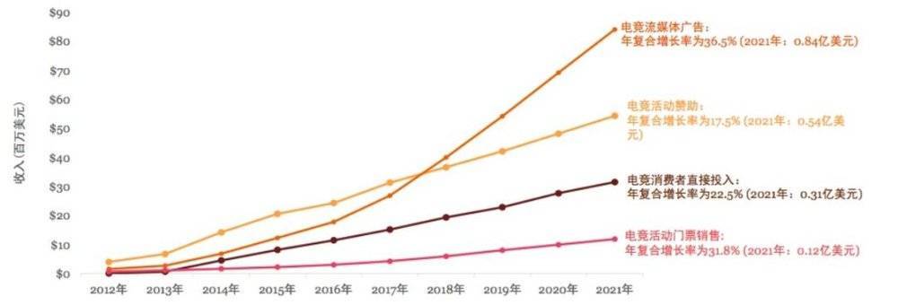 电竞游戏收入指电竞游戏消费总额 (即用户在游戏中的付费总金额);电竞衍生收入指包括电竞俱乐部及选手、直播平台及主播等收入;电竞赛事收入包括赛事门票、周边 以及赞助广告等收入。