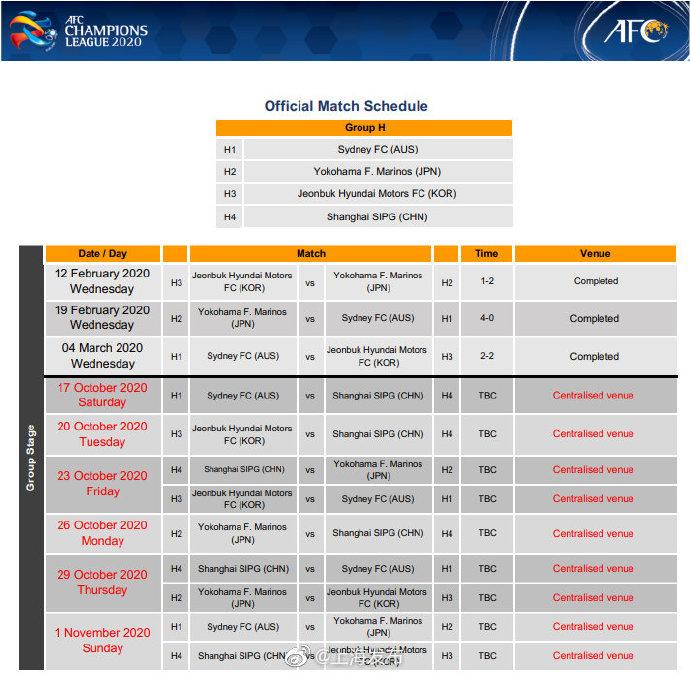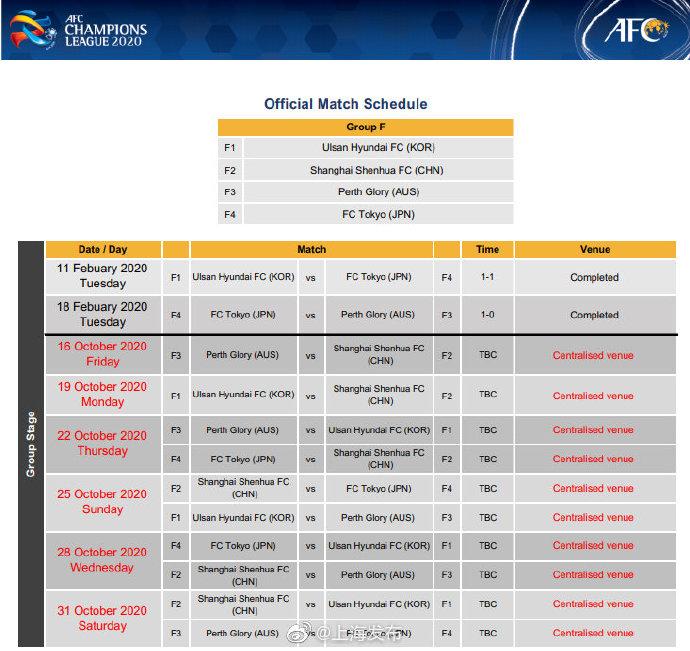 【2020亚冠联赛赛程出炉!申花、上港对阵安排在此】爱体育2020亚冠联赛赛程今日出炉!亚冠联赛官微发布,本赛季亚冠小组赛至半决赛阶段将以赛会制形式进行,淘汰赛及决赛均改为单回合淘汰制,比赛地点待定。申花、上港赛程详见10月16日 珀斯光荣 VS 上海申花10月19日 蔚山现代 VS 上海申花10月22日 FC东京 VS 上海申花10月25日 上海申花 VS FC东京10月28日 上海申花 VS 珀斯光荣10月31日 上海申花 VS 蔚山现代10月17日 悉尼FC VS 上海上港10月20日 全北现代 VS 上海上港10月23日 上海上港 VS 横滨水手10月26日 横滨水手 VS 上海上港10月29日 上海上港 VS 悉尼FC11月1日 上海上港 VS 全北现代