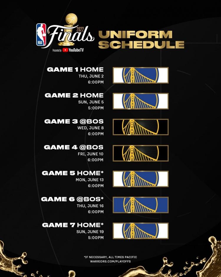 直播吧6月2日讯 勇士官方晒出总决赛各场比赛他们将会上身的球衣版本。