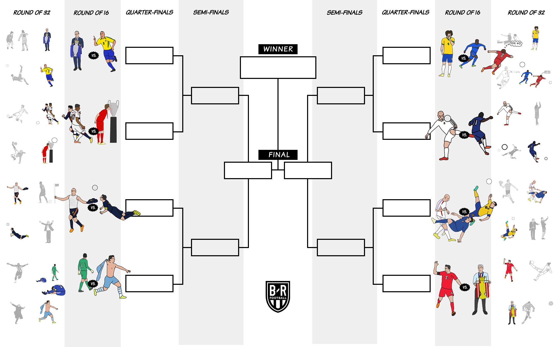 下半区,巴西1-7德国、路易斯流泪的瞬间战胜了同届世界杯苏亚雷斯的咬人;杰拉德滑倒瞬间击败了小贝绝杀希腊;齐达内欧冠决赛的天外飞仙击败了小罗征服伯纳乌;德罗巴欧冠决赛点球致胜击败了罗贝托绝杀大巴黎。