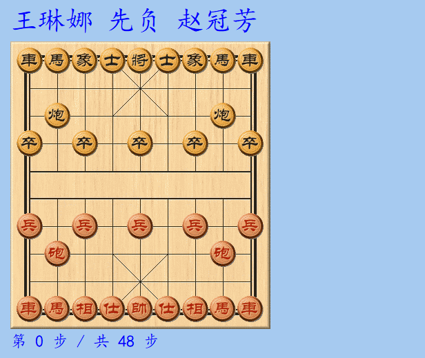 两人开斗,只见王琳娜执红棋弈出中炮阵,赵冠芳对以左三步虎,红方两头蛇。