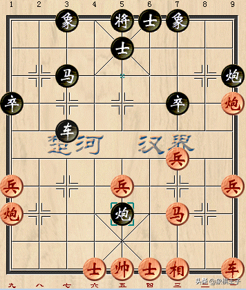 红棋左马跃进,踏去黑方中卒,黑马兑换,红炮打出。黑棋此刻甩中炮垫住中路,复换一车。