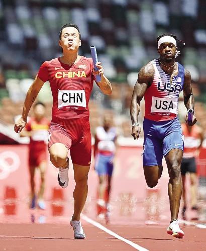 8月5日,中国队最后一棒吴智强(左)在东京奥运会男子4×100米接力预赛冲刺,中国队最终晋级决赛并获第四名。(新华社发)