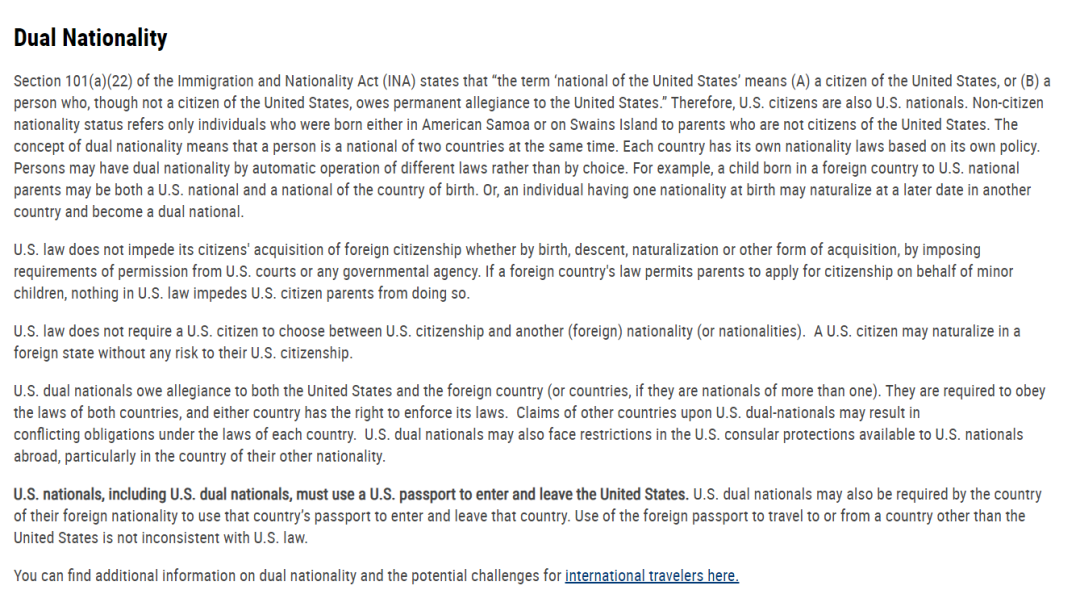 美国国务院网站公布的针对“双重国籍”的公开信息截图。