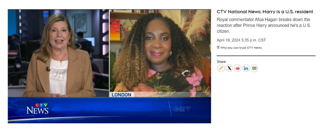 进一步检索发现,4月19日,CTV曾发布过另一条标题为《哈里现在是美国居民了》的链接。该链接指向一段2分20秒左右的视频。视频中,CTV王室评论员阿福阿·哈根(Afua Hagan)就哈里王子宣布成为美国居民一事进行了评论。但一旁的视频介绍却显示:“王室评论员阿福阿·哈根分析了哈里王子宣布成为美国公民后的反应。”