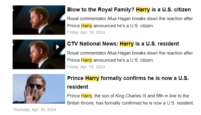 在CTV新闻台网站上搜索“哈里王子”等关键词,可以找到一个发布于4月19日的视频链接,标题为《王室受到重创,哈里现在是美国公民了》。但点击该链接,却无法找到与此标题相关的内容——CTV新闻台可能已经删除了原网页显示的内容。
