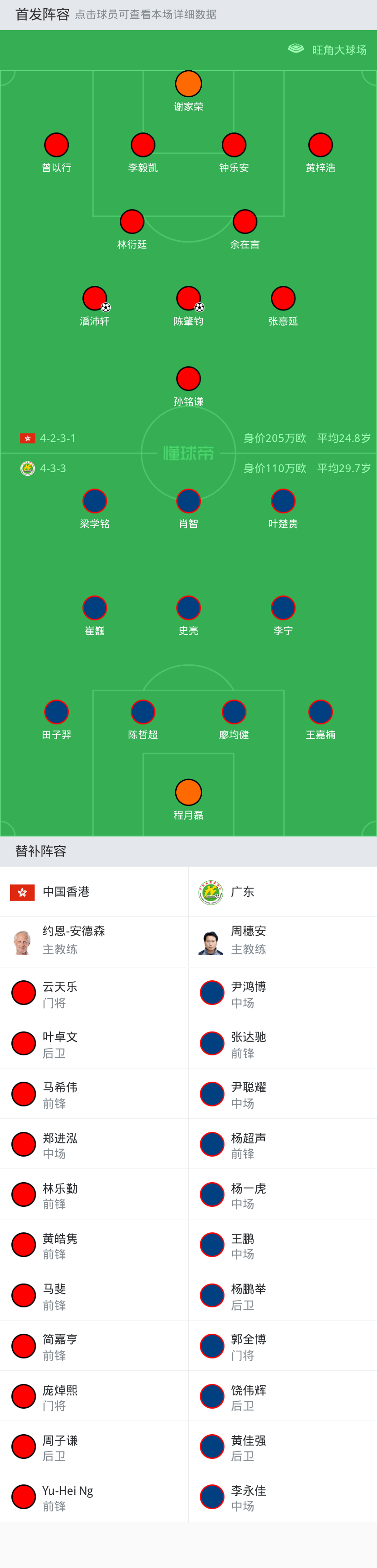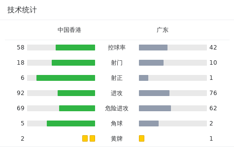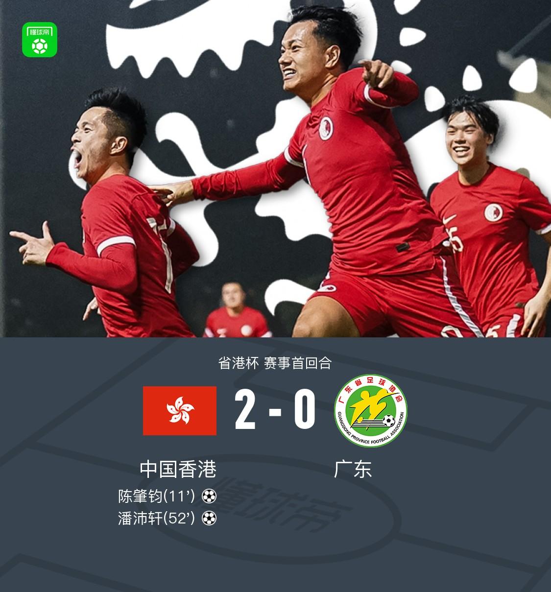 北京时间1月31日省港杯赛事首回合,中国香港对阵广东。中国香港队陈肇钧和潘沛轩分别在第11分钟和第52分钟破门,帮助中国香港以2-0战胜广东。