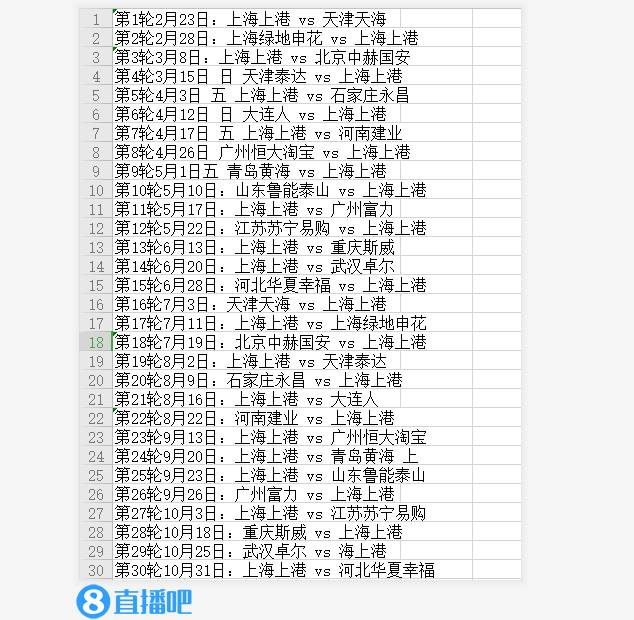直播吧1月22日讯 足协公布了新赛季中超赛程,上港首轮2月23号主场对阵天海,第二轮客场挑战申花,第三轮主场对阵国安。