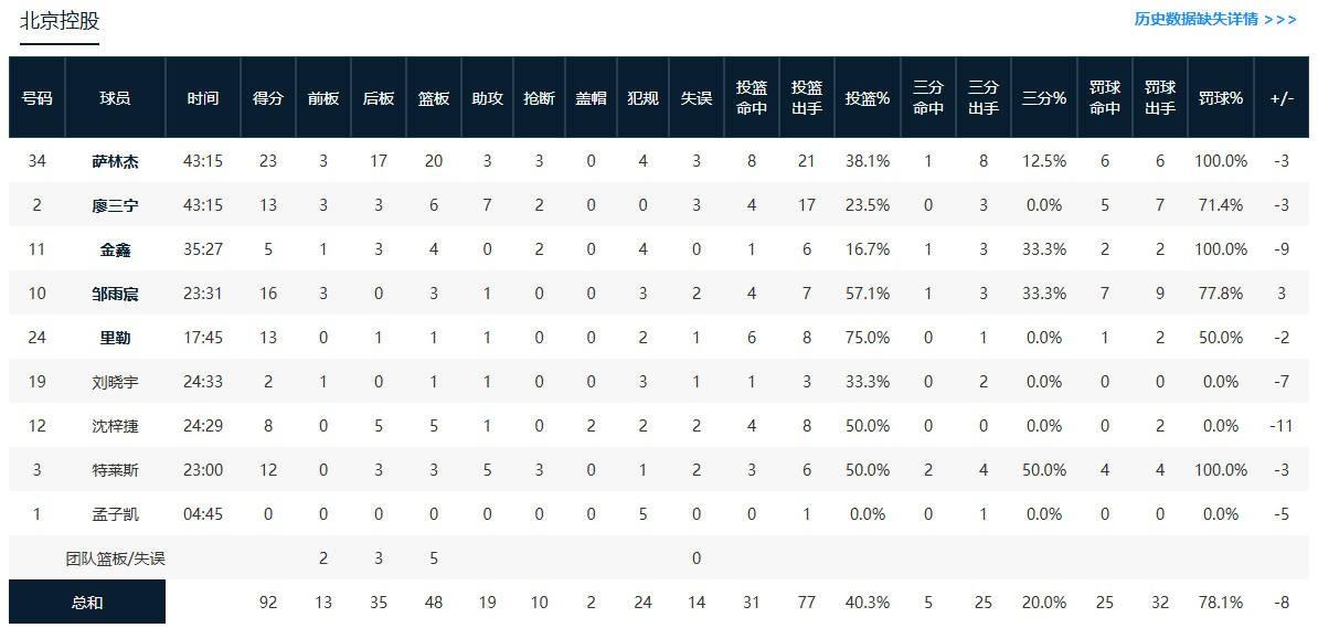 北京控股贾里德-萨林杰23分20板3助2断,邹雨宸16分3板1助,格兰特-里勒13分1板1助。