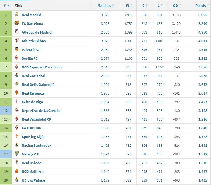巴萨与皇马相差175分排第二,比第三名的马竞则是多出1030分。4/5/6名的球队都是西甲的老牌劲旅:毕尔巴鄂竞技、瓦伦西亚和塞维利亚。