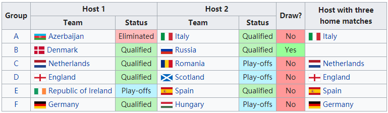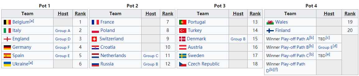 四档:威尔士、芬兰、附加赛A档胜者、附加赛B档胜者、附加赛C档胜者、附加赛D档胜者