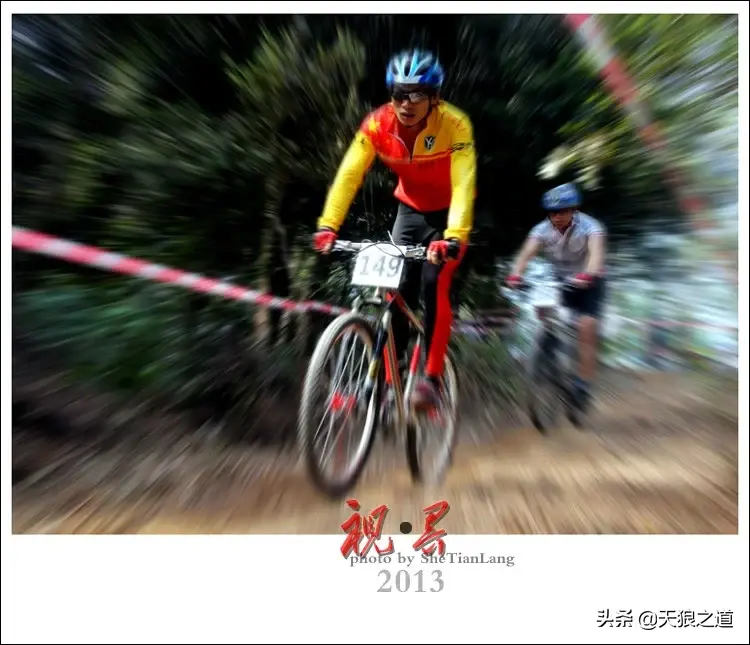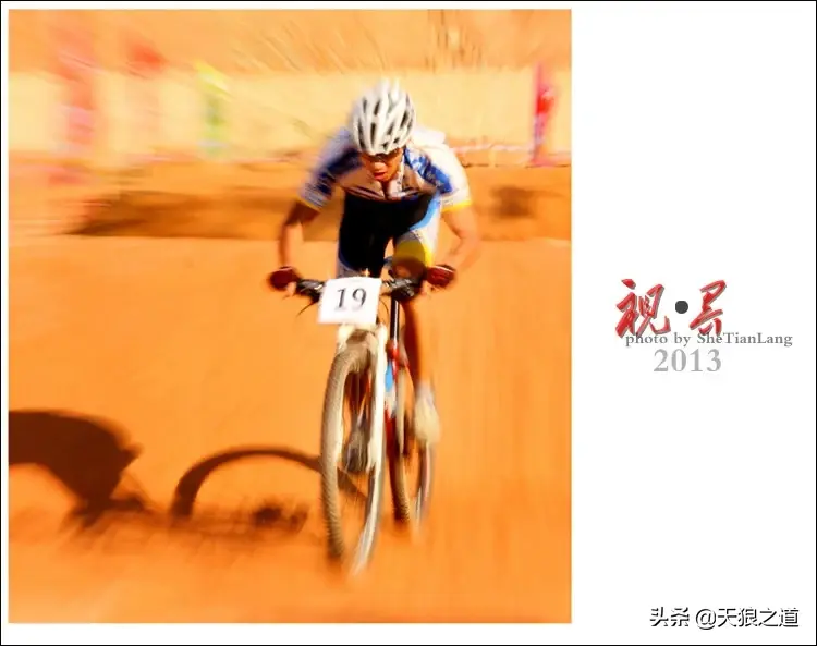 5、中心推曝拍摄: 使用长变焦镜头,正面拍摄迎面而来的车手,设置相机为高速连拍模式,长按快门的同时,迅速变焦,用推曝方法,拍出画面主体清晰,周围环境呈放射性模糊线条,增强画面的视觉冲击。这种方法拍摄的效果是快门越慢,速度感效果越明显,但拍摄难度也更难,利用脚架拍摄相对会容易一些,但会受到拍摄角度的限制。